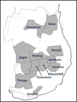 The field called ‘Wore’ became part of Park Farm (about 350 acres), whose former buildings are on Kennington Road. In 1768 the tenant was John Farbrother. Three of the roads at The Lawns are named after fields at Park Farm.